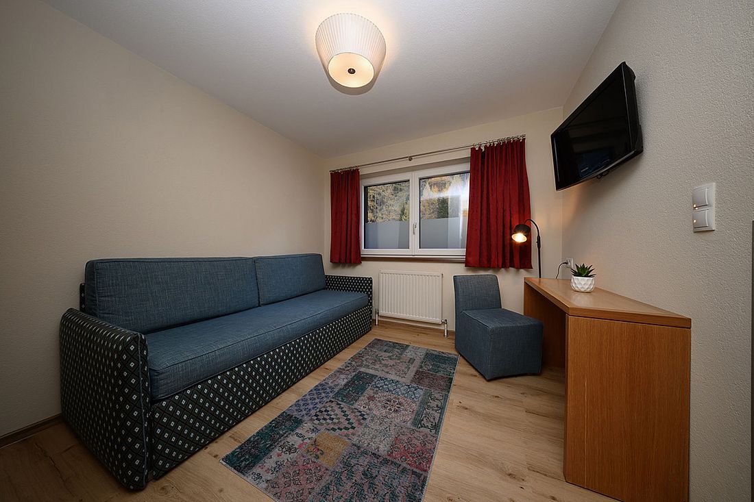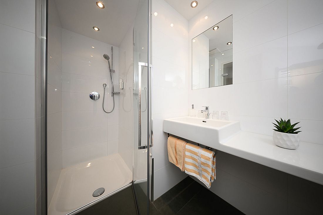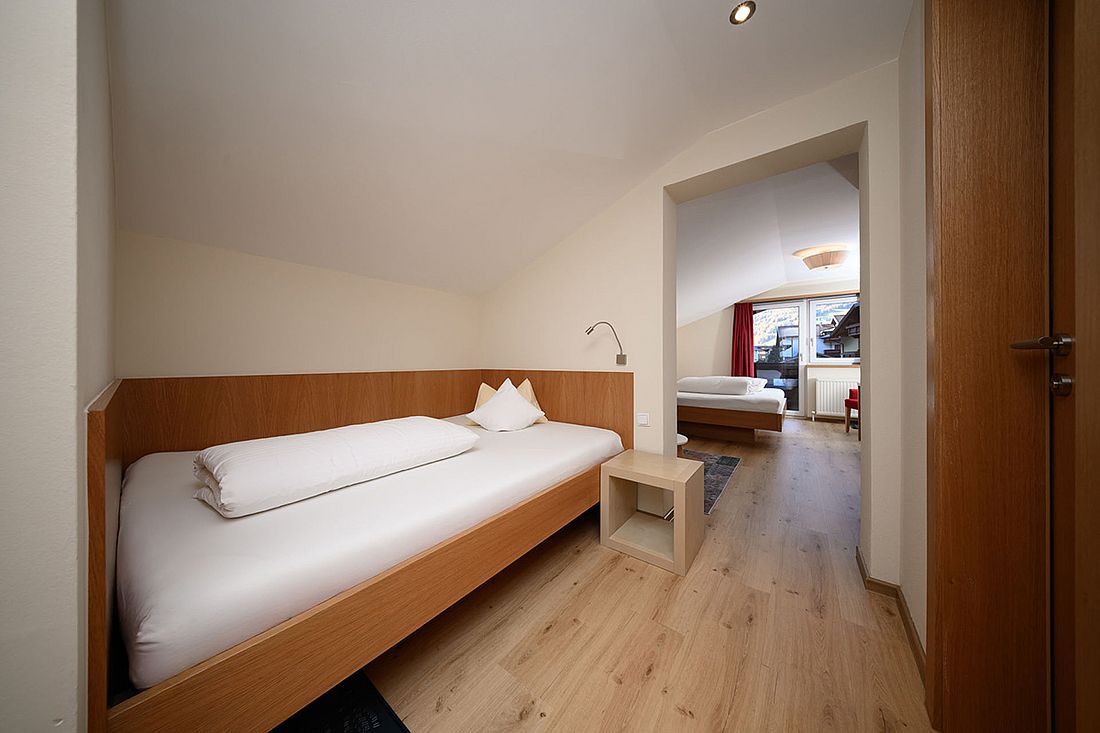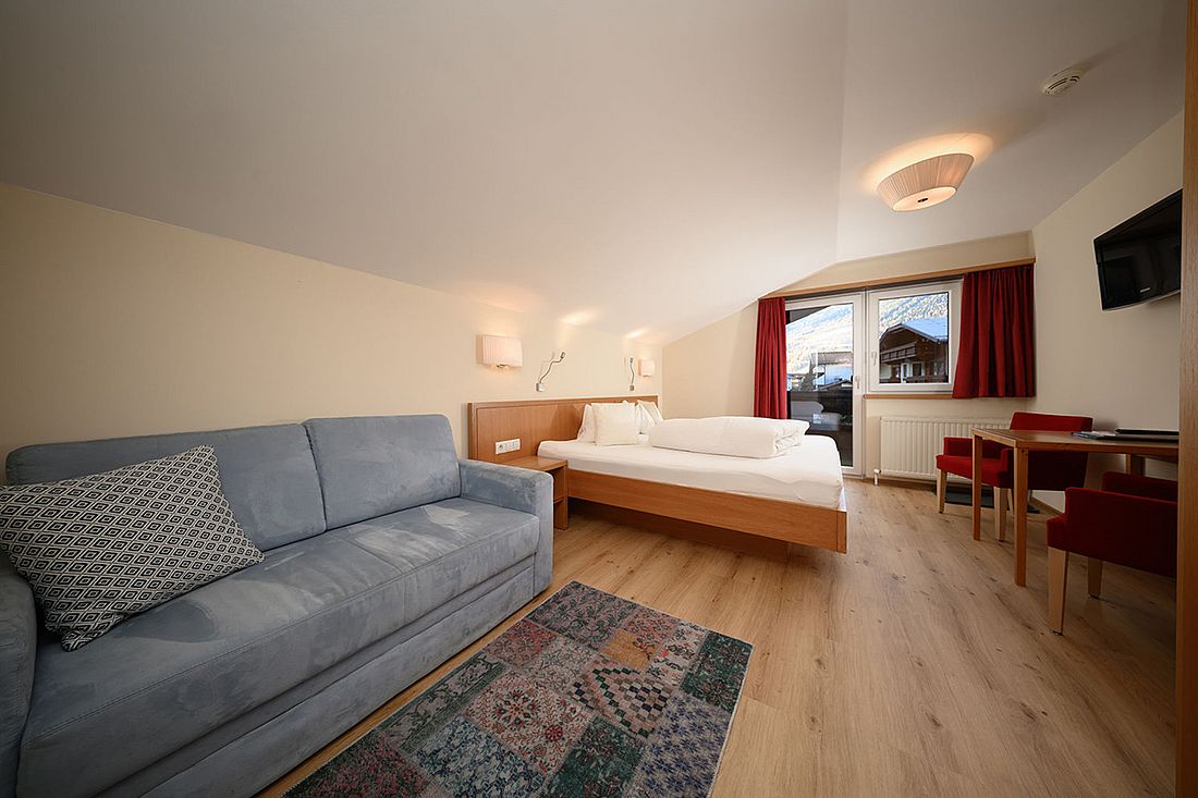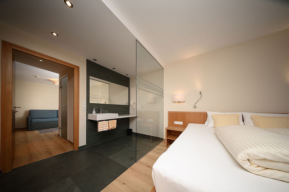 The suites are 55 m2, have a double room and a separate living/sleeping area with single bed, couch and cosy sitting area with flat screen TV. There is also a bathroom with shower, a separate WC and a balcony with seating area.