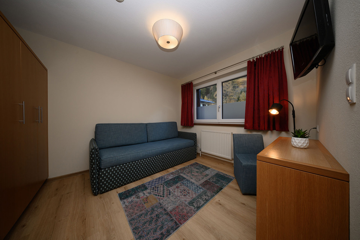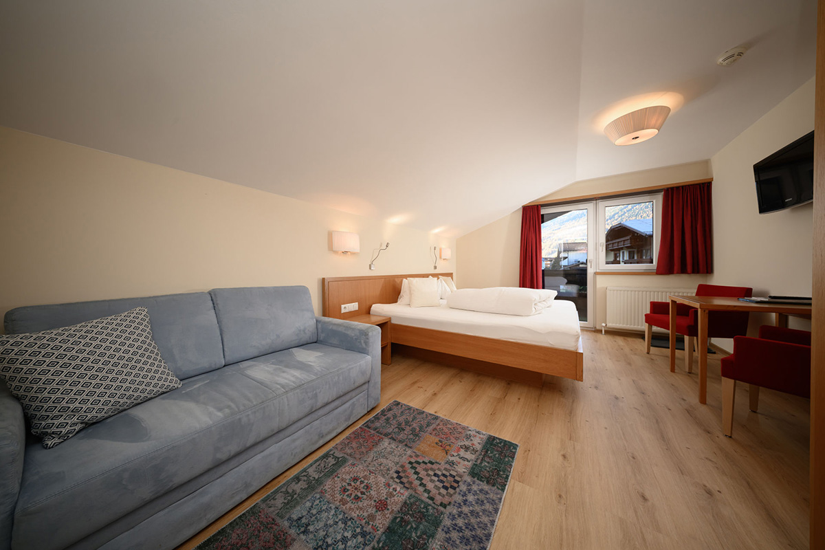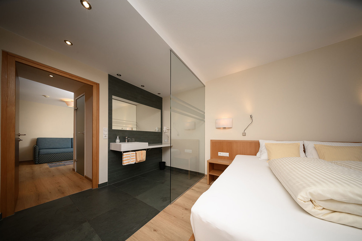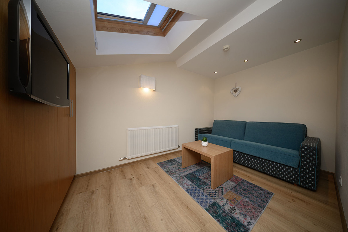 The suites are 55 m2, have a double room and a separate living/sleeping area with single bed, couch and cosy sitting area with flat screen TV. There is also a bathroom with shower, a separate WC and a balcony with seating area.